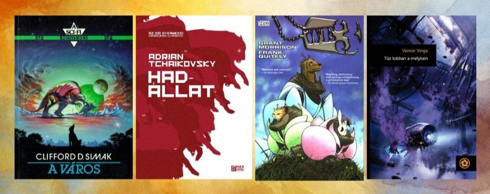 Adrian Tchaikovsky Hadállat című sci-fije viszont friss, alig néhány éves könyv, amelyben egy genetikailag módosított, korlátozottan intelligens, katonai harcikutya és társai, sárkánnyal, Brumival és Rajjal alkotnak egy osztagot, és különféle bevetésre küldik őket. Rex jó kutya, engedelmeskedik a parancsoknak, de aztán megkérdőjelezi ennek az egész öldöklésnek az értelmét, és a saját erkölcsi érzékére kezd el hallgatni. Remekül megírt kutyaszemszög, és egy nagyon szórakoztató, és egyben gondolatébresztő regény.