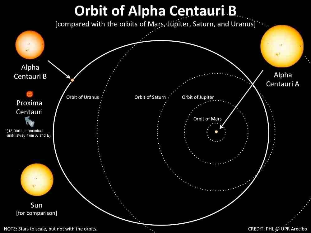 A legközelebbi csillag a Proxima Centauri, egy kis vörös törpe 4,24 fényévnyire. Az Alfa Centauri egy kettős csillag kb. 4,34 fényévnyire, amelyek egymás körül keringenek, és kb. 80 év alatt tesznek egy kört egymás körül. (A három csillagot szokták együtt a Centauri hármas csillagrendszernek is nevezni.)